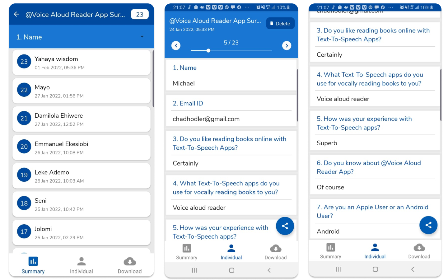 I ran a survey with 23 applicants with the Forms App which is a great tool to run surveys and get data using a phone. I designed a Survey with Forms and sent it to people/potetials users to know if first and foremost users would love to use TTS apps, if they knew about @Voice TTS App and what type of devices users use for this. The research was quite successful and here are the takeaways we got from the research: