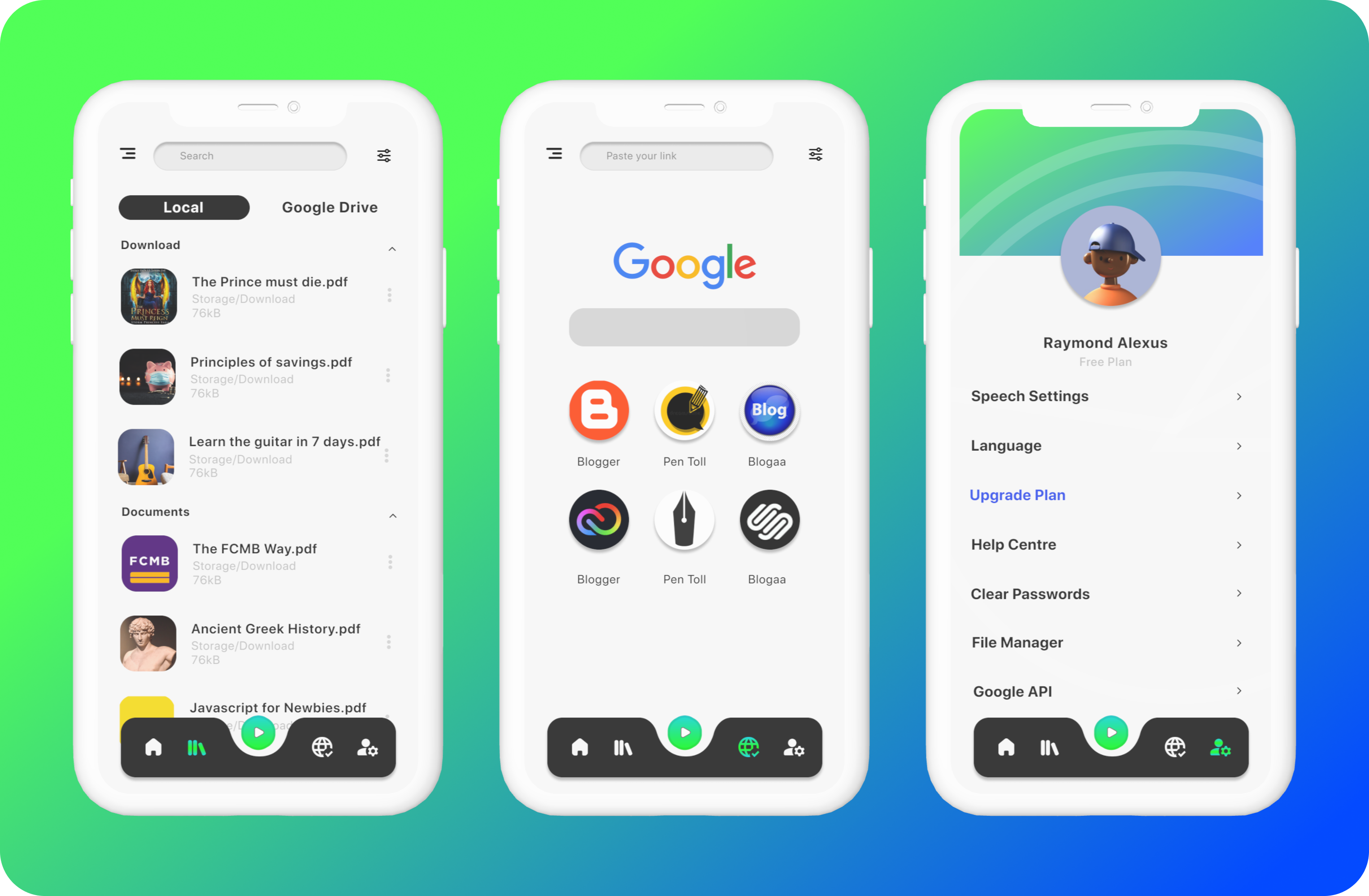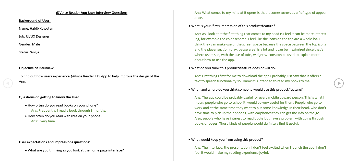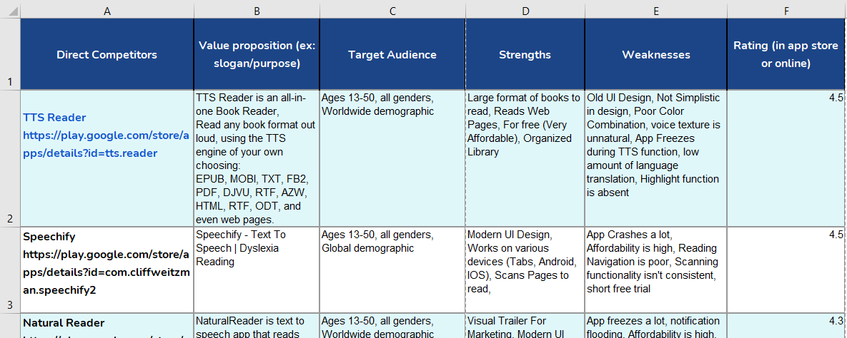 I went up on the google store to find out I comment sections, what pain points users had with other TTS apps, what users complained about most and wrote them down. This helps me focus on users and solving their problems. I looked at some other reading apps for inspiration.