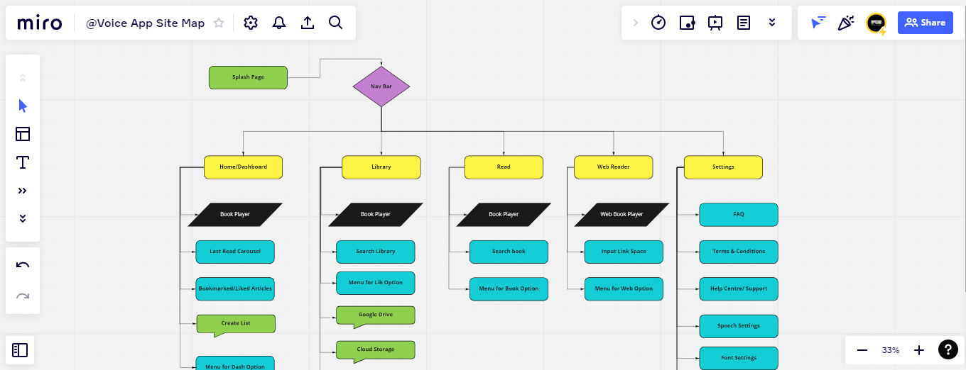 At this stage I was clear about the design problems. I made some sketches and created a SiteMap on Miro to help with a distinct information architecture for the App (Miro is a great tool for UX Research and project management). This was also good for the stakeholders also because it gave them a bird eye view of the App’s structure.